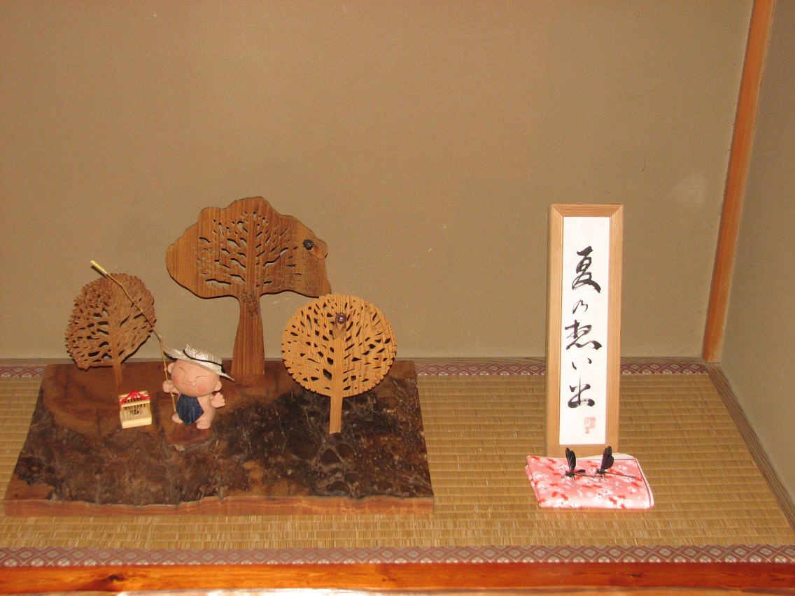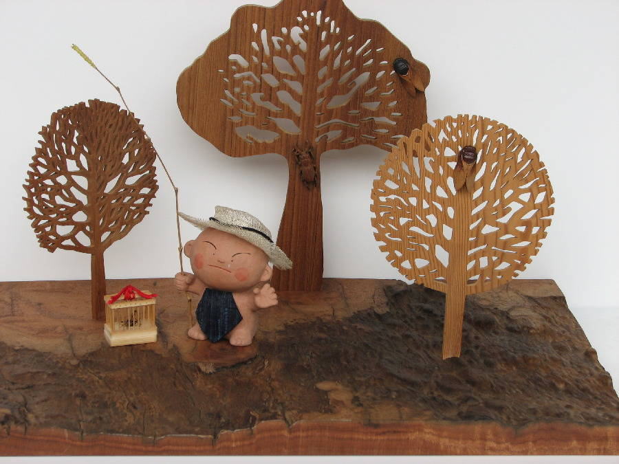 しています。よく見ると、クワガタ虫。蝉の木彫りが埋め込んであります。童(わらべ)人形に