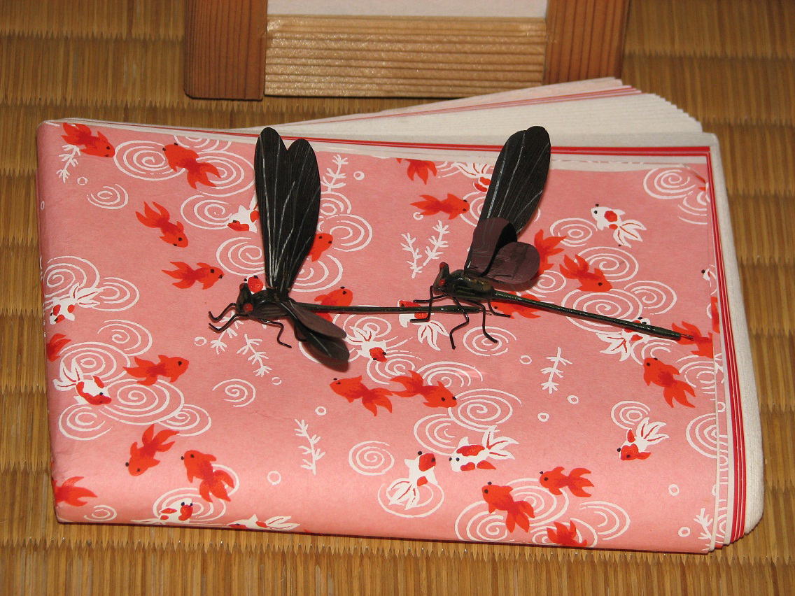 紙敷は金魚柄で香合が重なるので、川辺に生きるカラストンボの尾継ぎ(おつなぎ)と洒落て見ました。