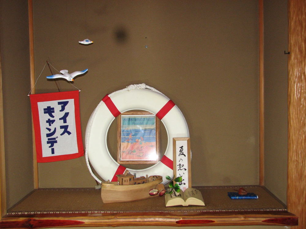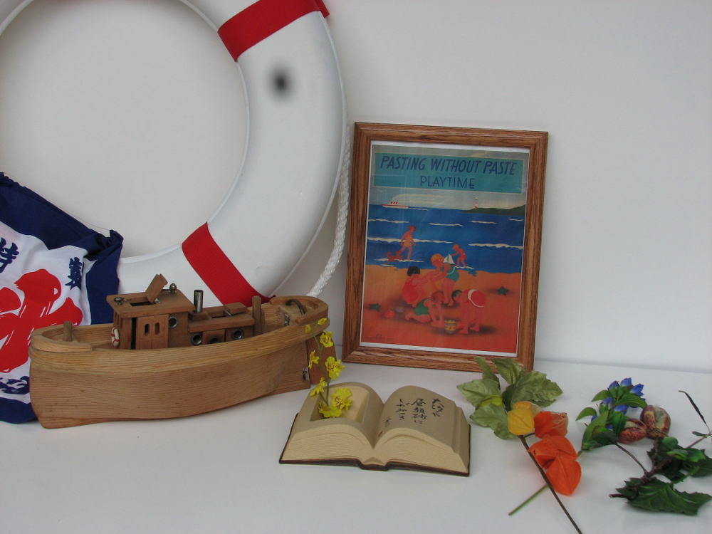 「海の想い出」をテーマに考えます。「昔風の浮輪」「アンティークポートレート」海水浴場と