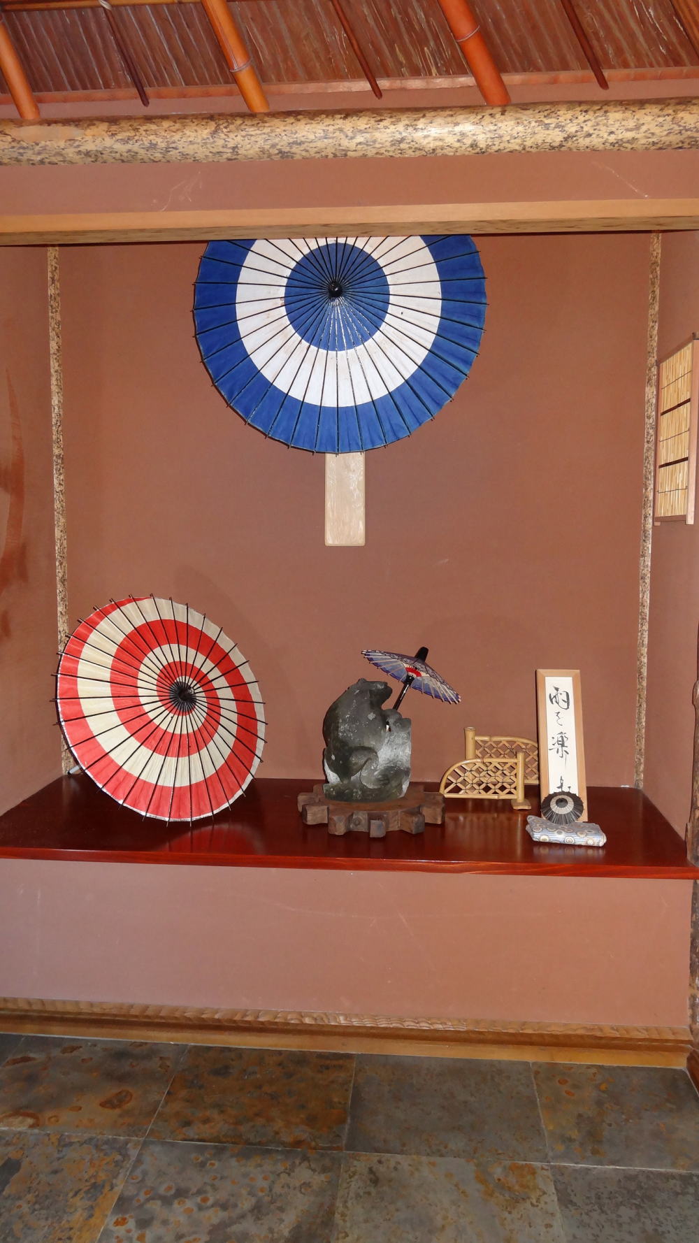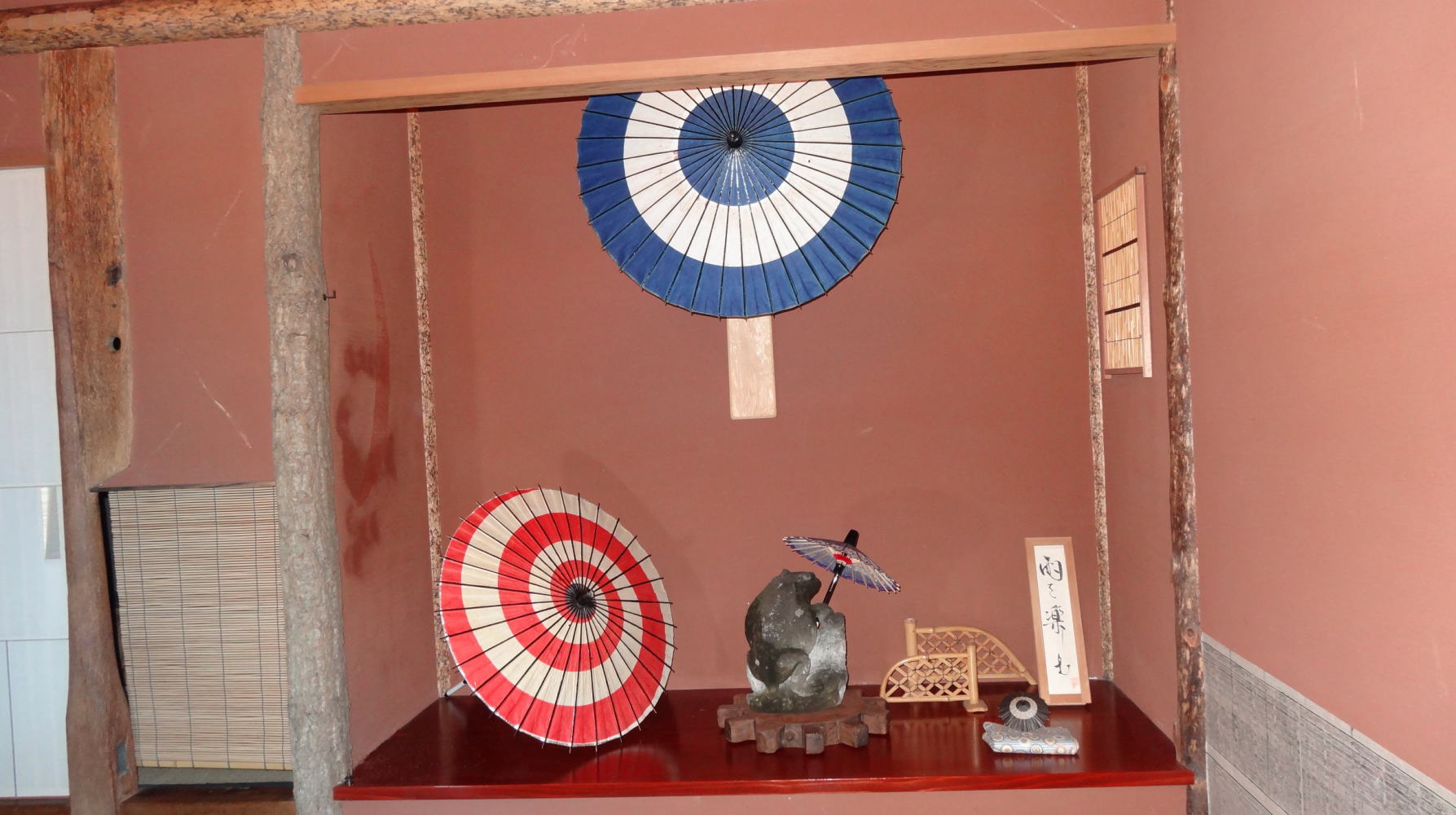 ここでは赤と青の昔からある物を使いました。傘は開いてただ置くだけでは床の間の天井高との