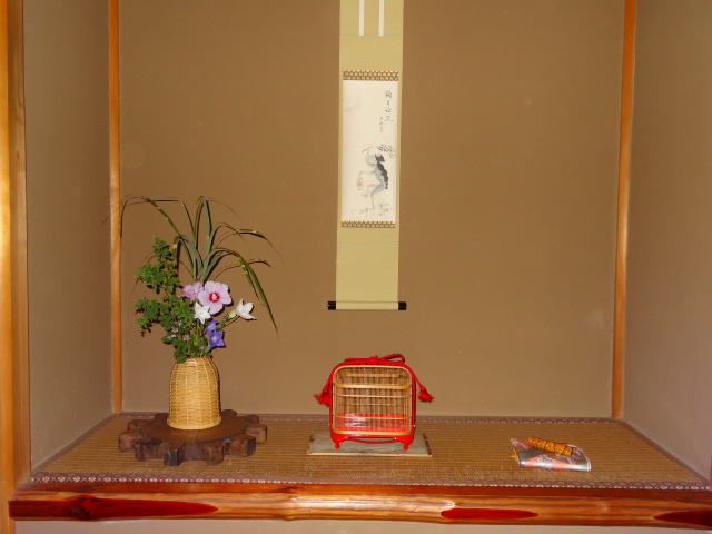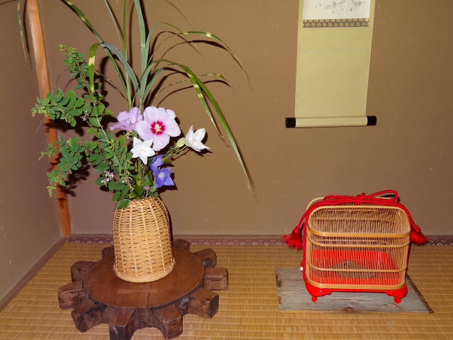 これもどことなく寂しさの演出の為釣鐘′^の竹籠に夏秋の生花を入れてあります。