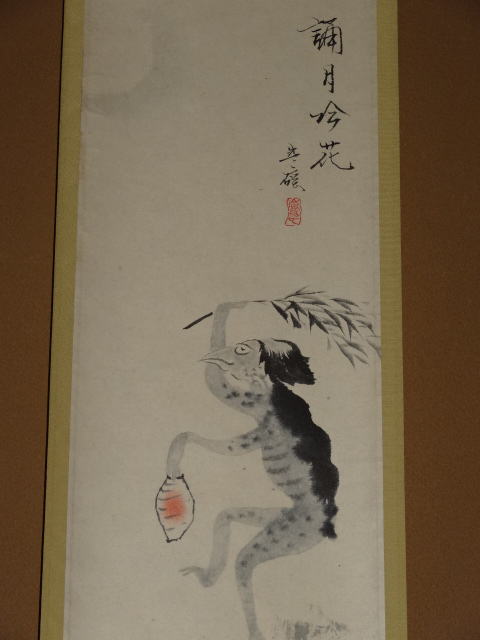 河の土手でカッパが人間の真似をし、月を愛で酒に酔い笹枝をかついで良い心持ちで
