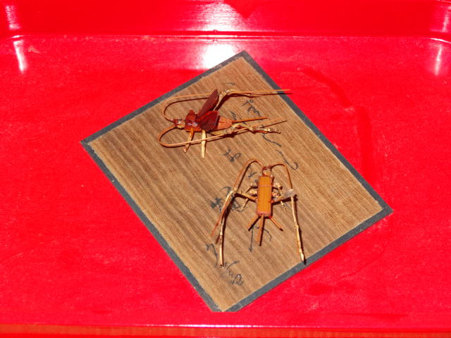 駿河の千筋細工の虫籠です。中に同じく竹細工の鈴虫≠ェ虫の歌の百人一首の札に居ます。