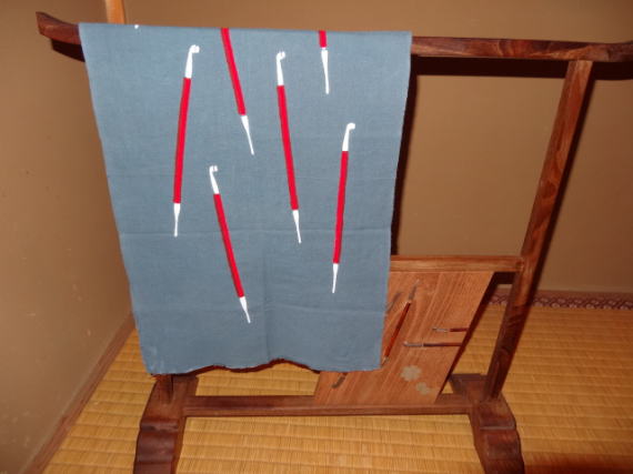 大きな煙管(きせる)を主に、煙管模様の手拭い、江戸趣味の手拭い掛けにも煙管の透かし彫りが