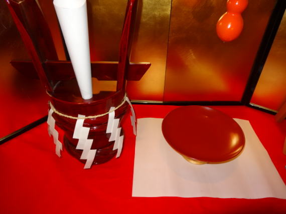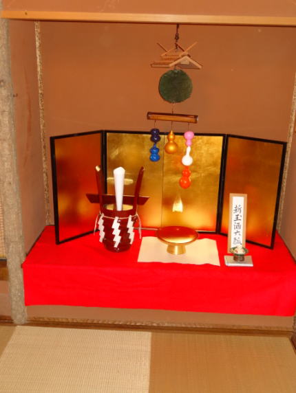 床にコモ酒樽を置いても迫力がありますが、当時上等とされた塗りの角樽(つのだる)に注連縄(しめなわ)を張り