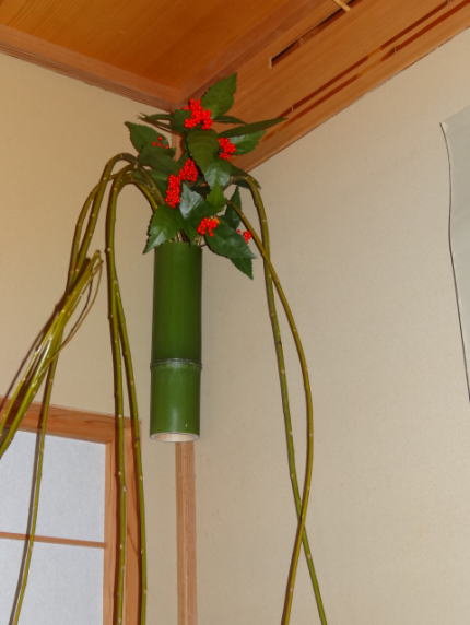 花入:青竹尺筒一節切(ひとよ)結柳・根締千両