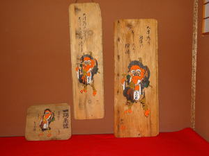 大津絵の各種板額とお多福の面です。いろいろな床の間のサイズにより掛け替えています。大きいものは