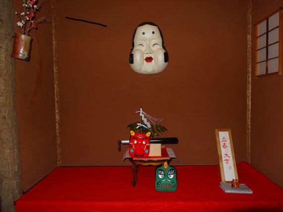 床中央にタテ40pを超えるお多福≠フ面飾りを主体の飾り付けです。節分¥りと変わりませんが面飾り