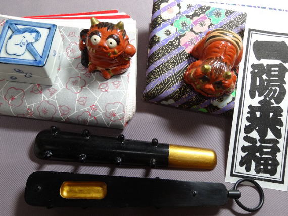 当り棒は山椒の木の見立てが面白いです。写真の金棒は手作りで元は千円程度の麺棒をうまく使って出来ています。