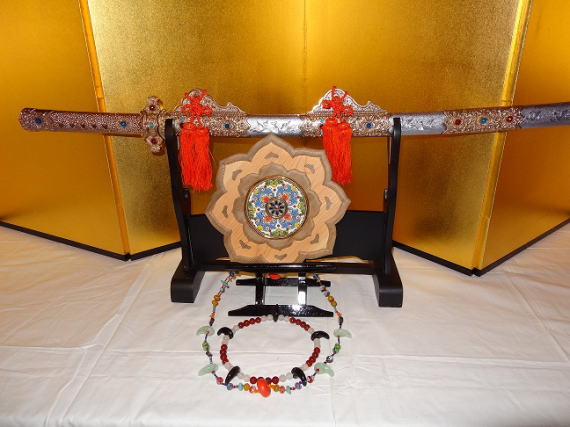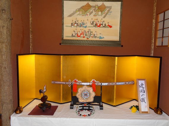 飾ってみました。三種の神器とは、@「八坂瓊勾玉(やさかにのまがたま)」A「天叢雲剣(あめのむらくものつるぎ)」