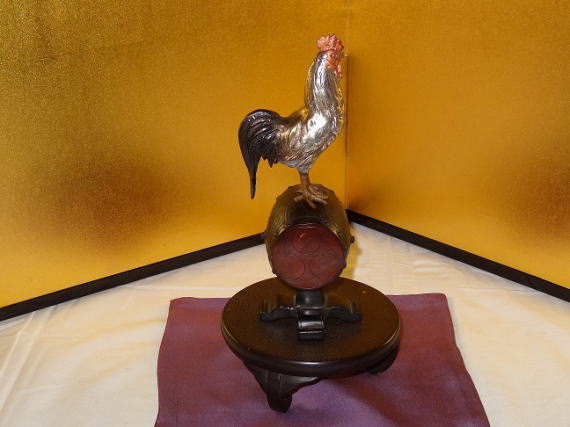 長鳴鳥(ながなきどり)を格調高く紫の袱紗(ふくさ)・黒漆塗り円薹に置かれています。