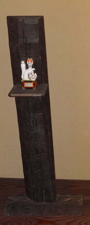 古都鎌倉、古刹の栗材の梁(はり)を利用して作った狛犬台です。ここでは狐の焼物の像を置いています。
