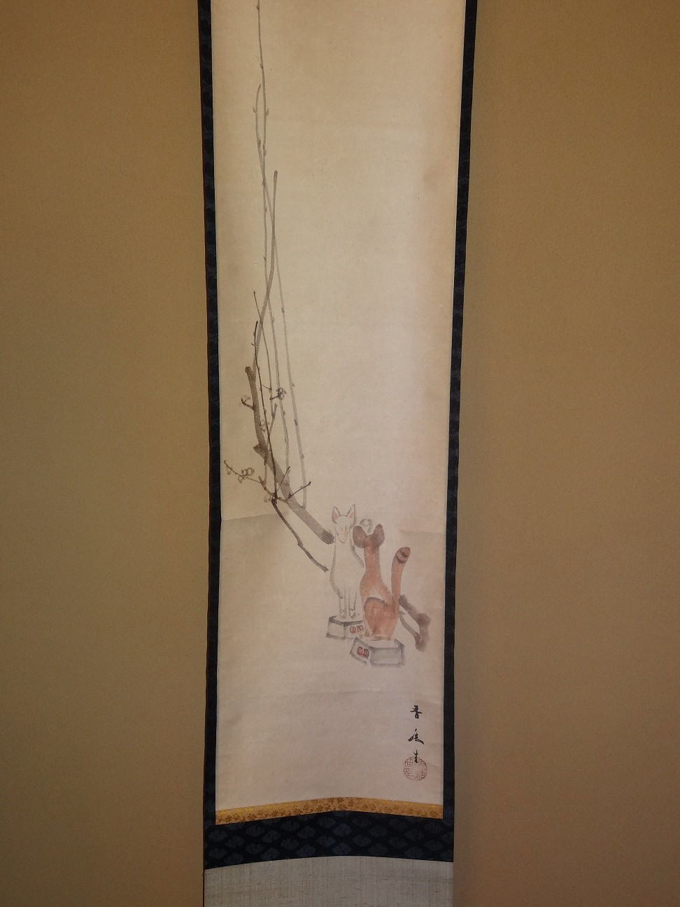 床中央に稲荷の使いの狐のコマ像に白梅の咲き誇る木が描かれています。