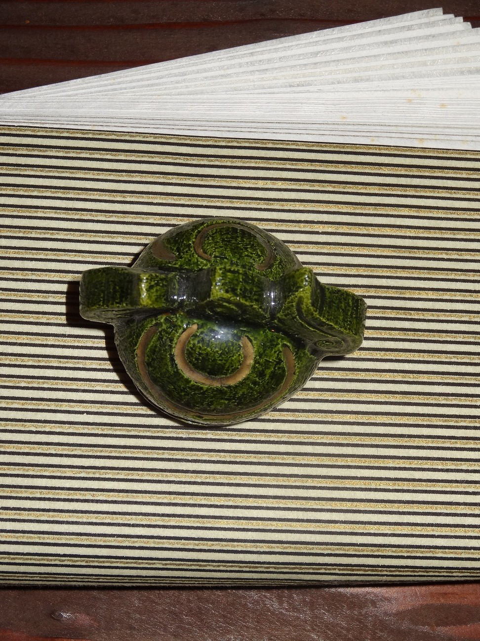 紙敷:唐桟(とうざん)柄 香合:緑釉楽焼宝珠