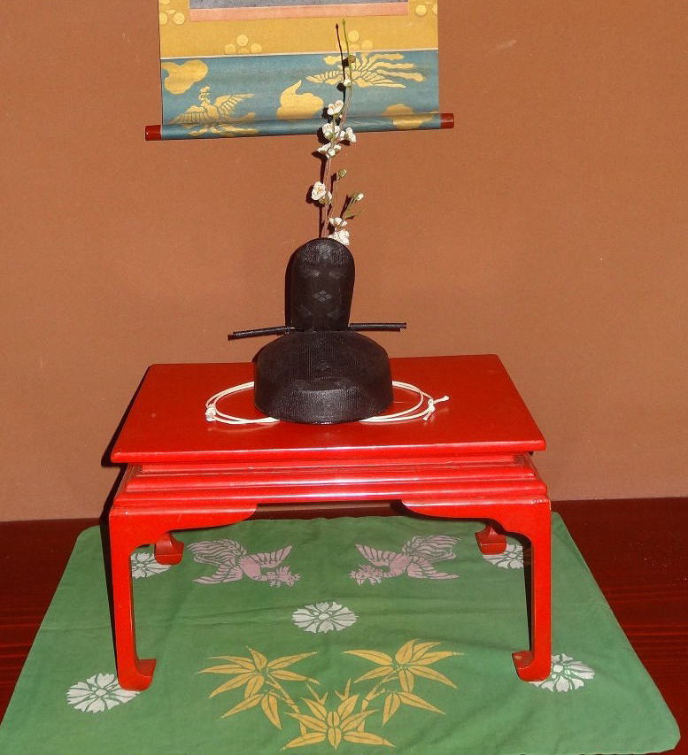 御冠(実際に宮中で作られていたもの)を置き御冠の後ろに一枝の白梅を差し入れています。