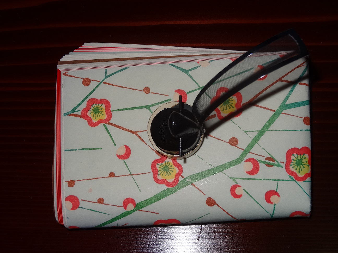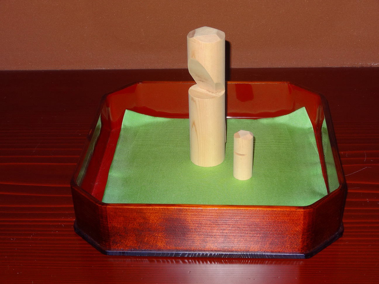 朱塗り折ため盆に飾った鷽の木彫り