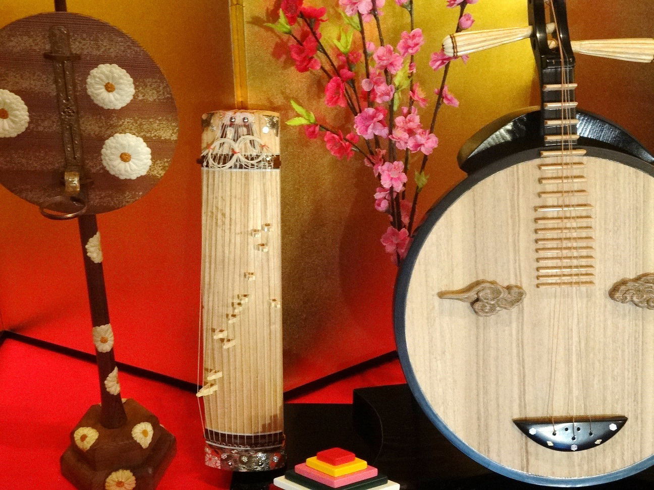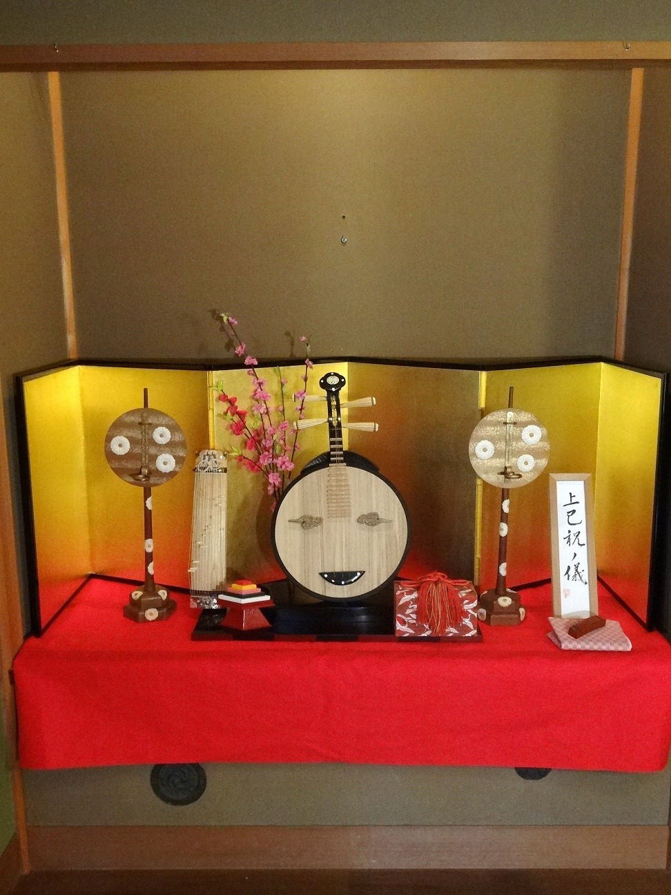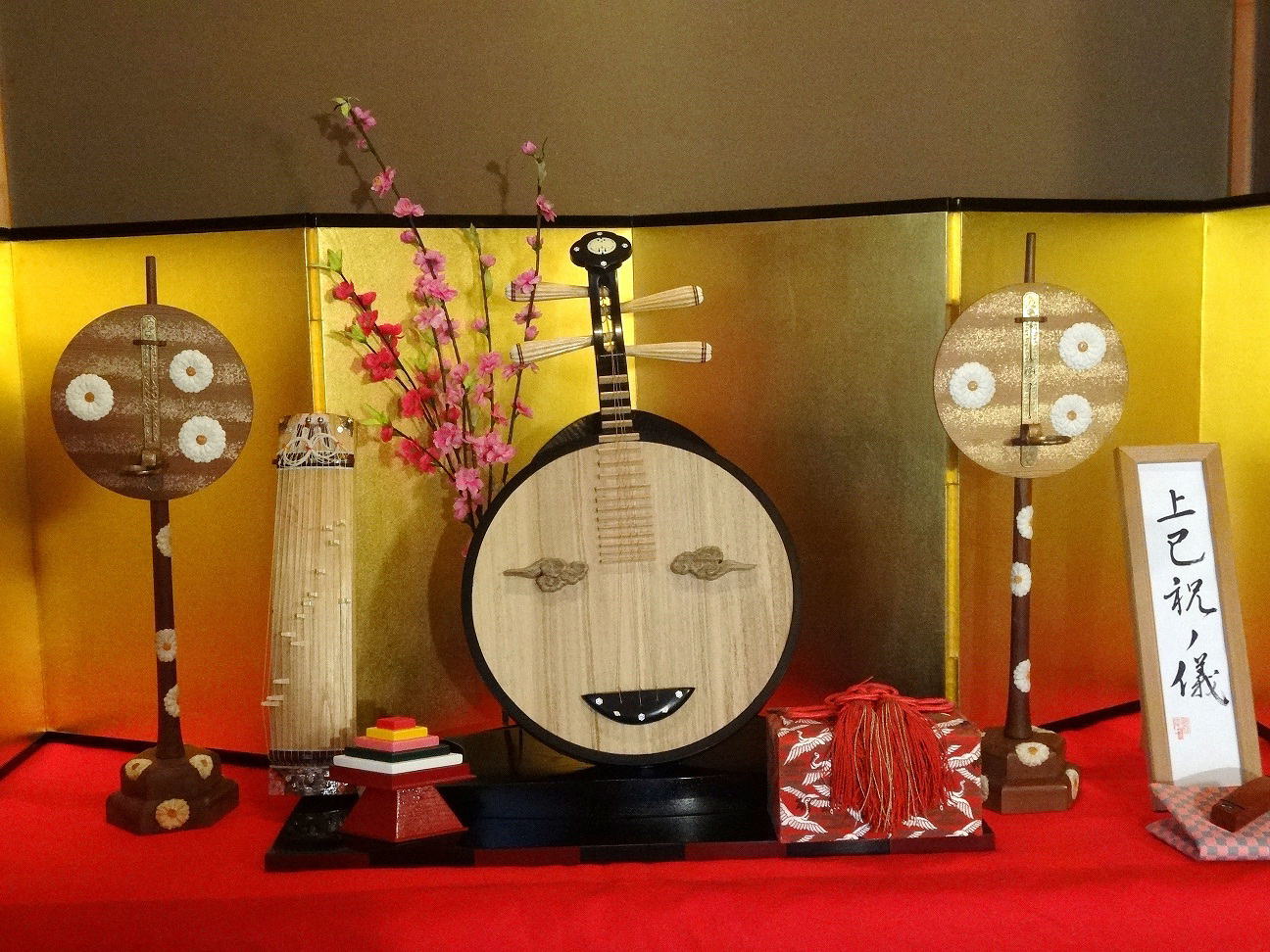 歌舞音曲の上達を願う飾り付けです。上巳祝の儀弐と背景飾りは変わりませんが、中央に月琴(げっきん)