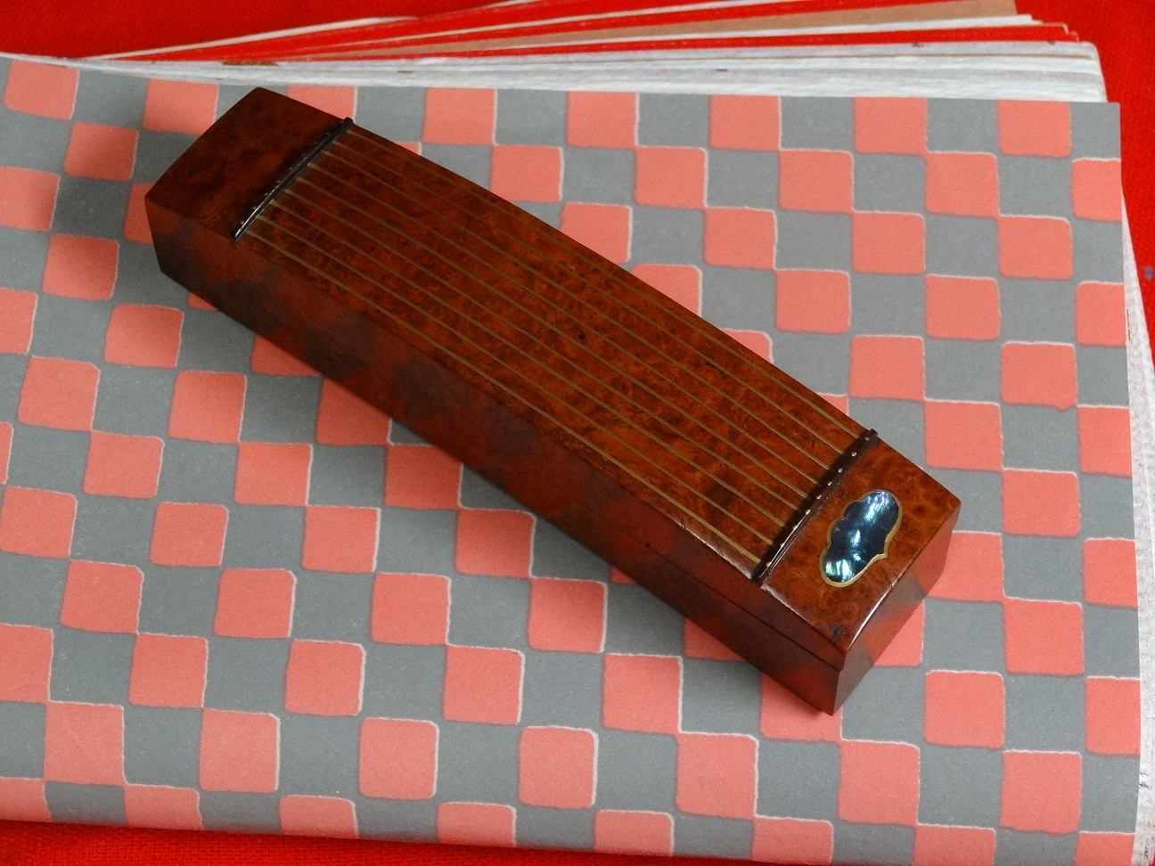 桃色の市松模様紙敷に花梨材でつくった唐木細工の琴香合≠フ取り合わせ