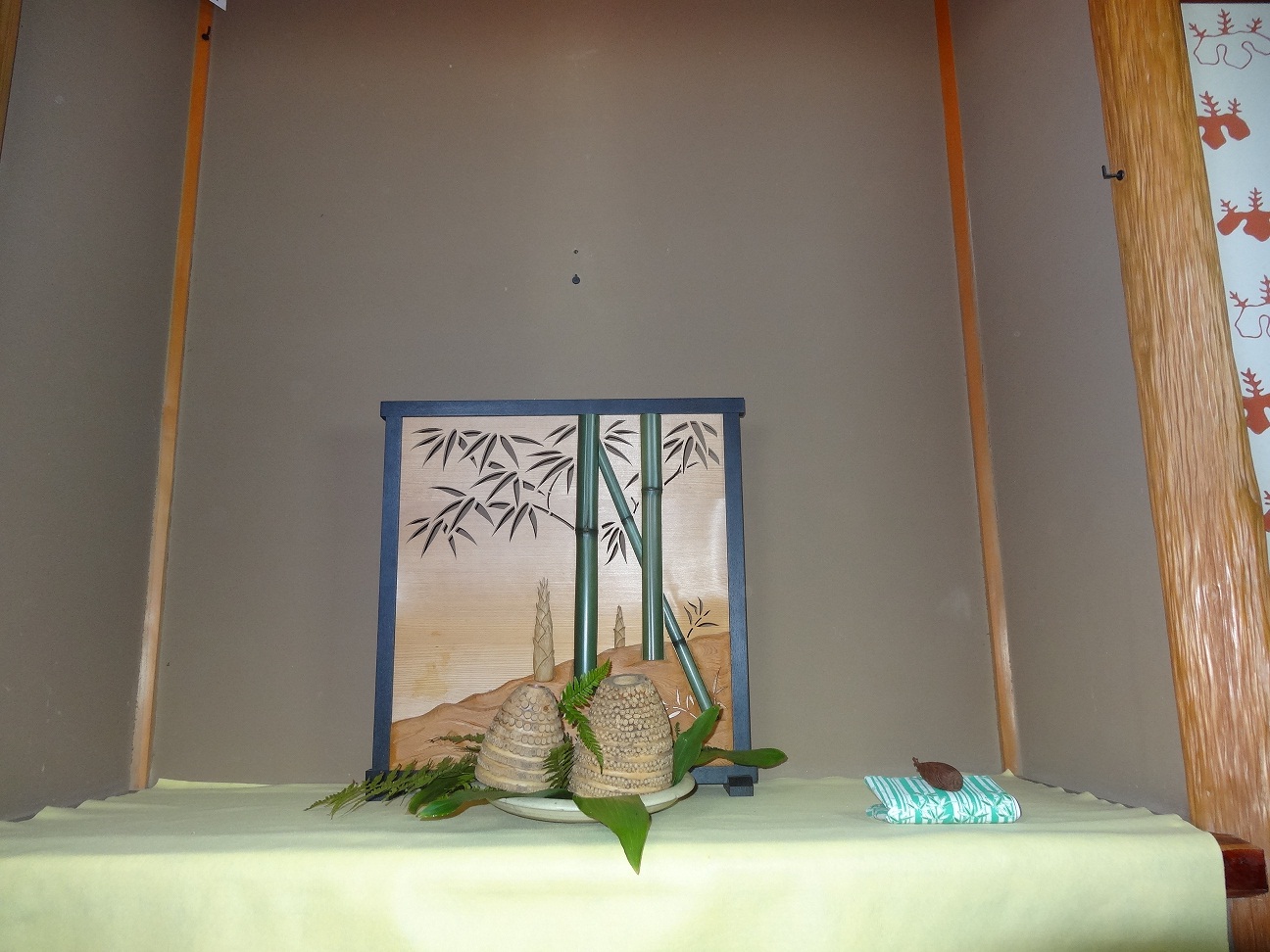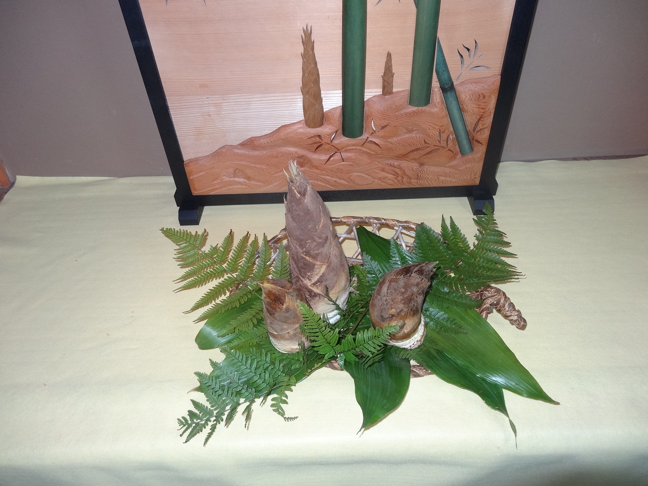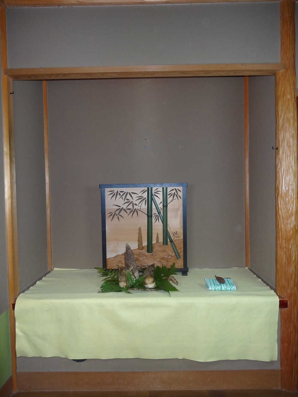 淡い山吹色の毛氈を敷き、床中央に竹林の飾り衝立を置き、朝取り立ての筍を籠に飾ったあっさりした