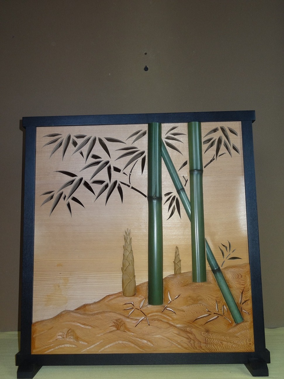 竹葉を透かし彫り、筍を桑材の彫り象嵌とした凝った造りの衝立です。額飾りでも絵になりますね。