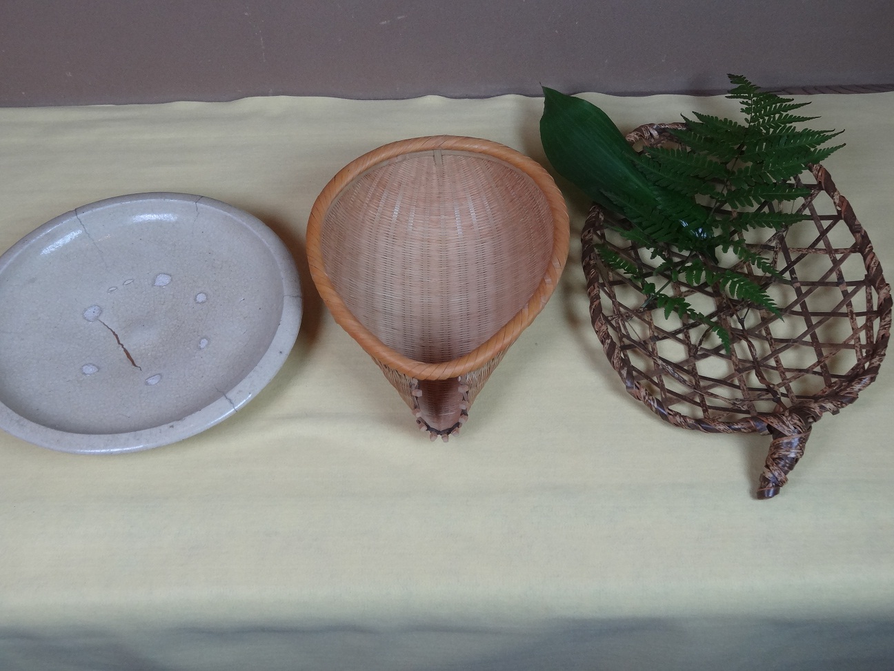 身近な皿、ザル、籠に時季の物と敷葉で表現の巾が多岐にわたります。