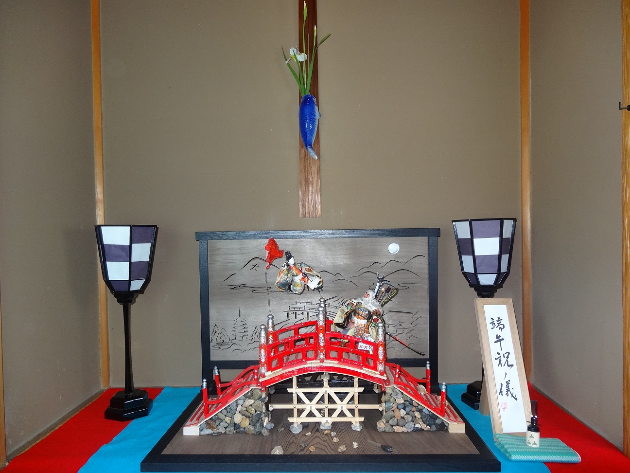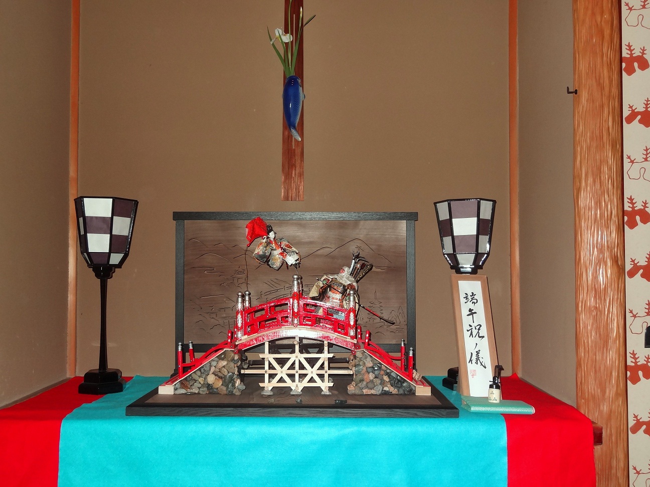 牛若丸と弁慶°梃ワ条大橋の一騎討ちの場面。五月人形を使った床飾りです。