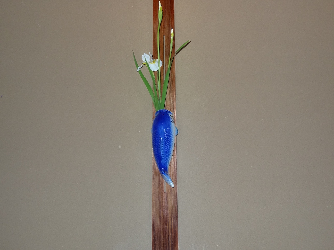 瀧割板(黒部杉)を滝に見立て鯉の花入れで鯉の滝登り