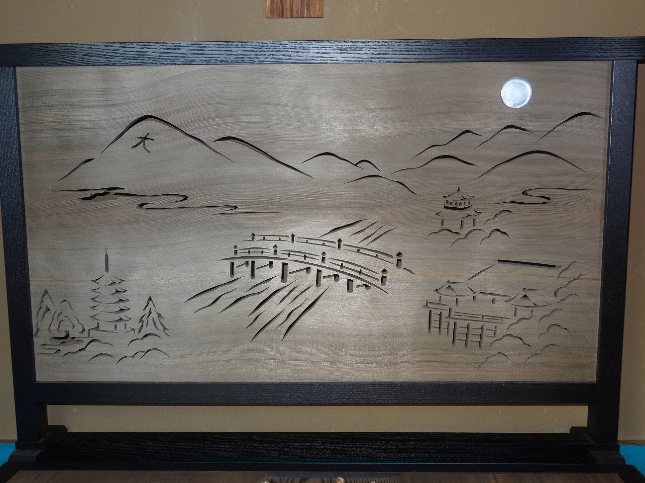 戦いが月明かりが頼りの夜なので、地板・衝立共、黒神代杉を用いています。背景の衝立に京の