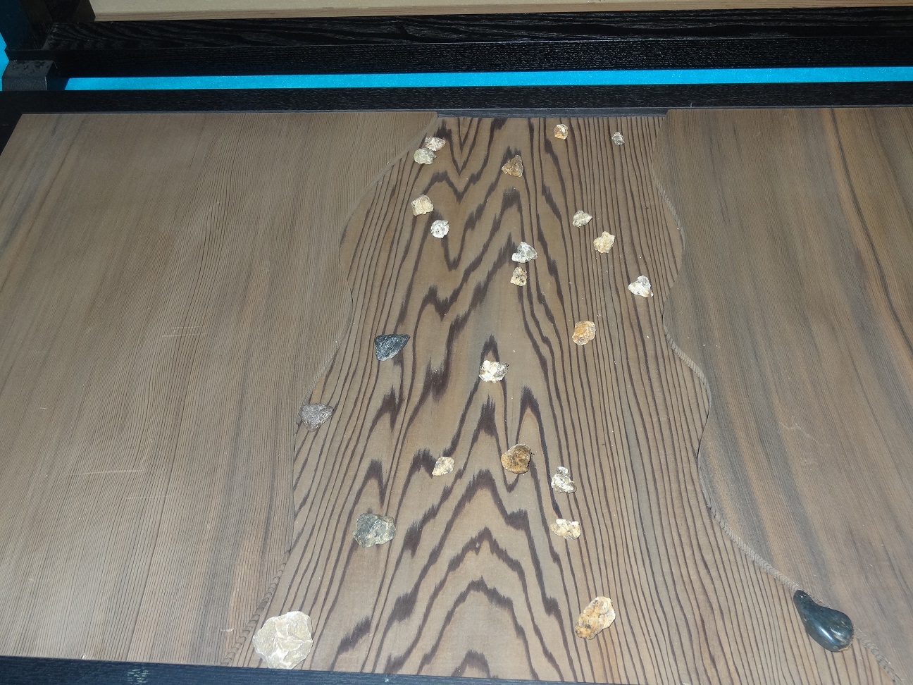 地板は神代杉の杢目・柾目に厚みの段差を設け、川面を表現し、流れに小石を置き合わせています。