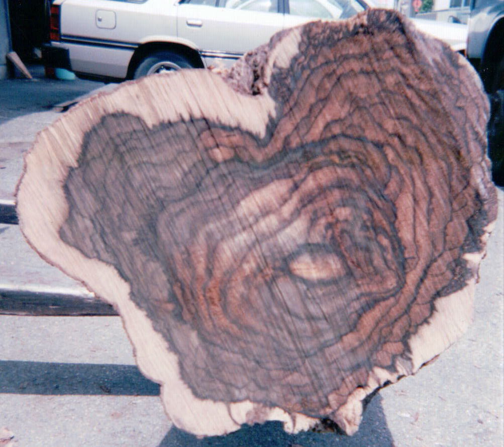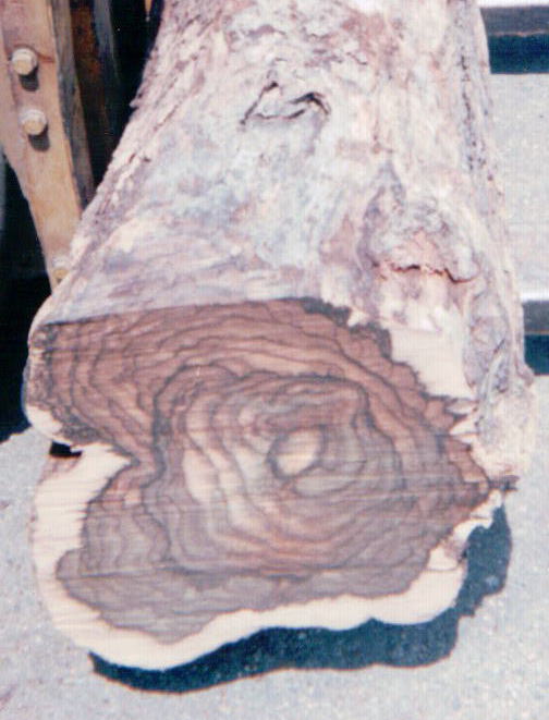 切って倒してみないと解らない黒柿原木の根切り口