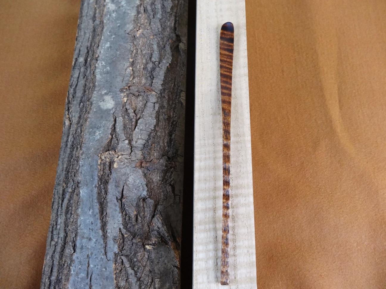 左は栗材の鬼皮肌の木地です。右の茶杓下の材は栗の老齢樹木に見られる縮緬杢(ちりめんもく)、業界では